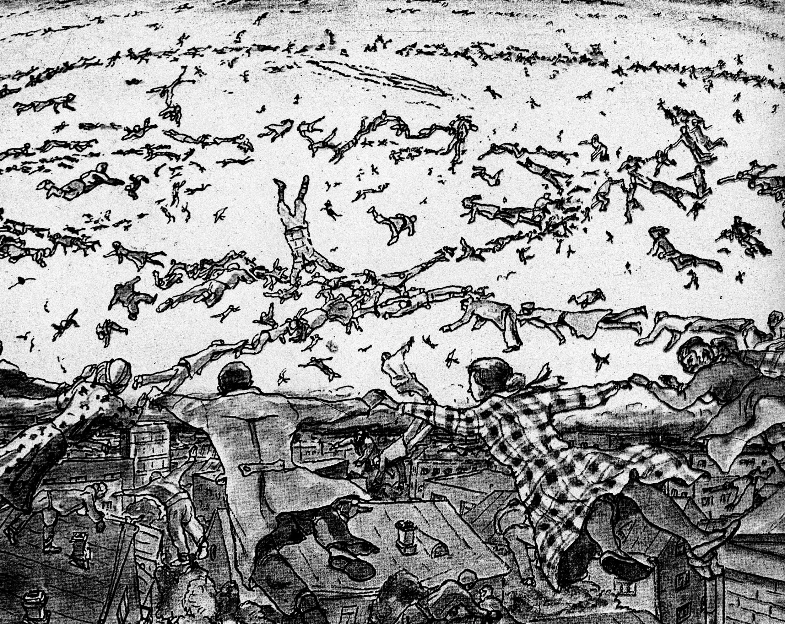 In The Flying Komarov (1972-1975), a part of the Ten Characters series, a man leaps into space, after a fight with his wife, joining “kindred souls” sailing through an infinite space.[21]