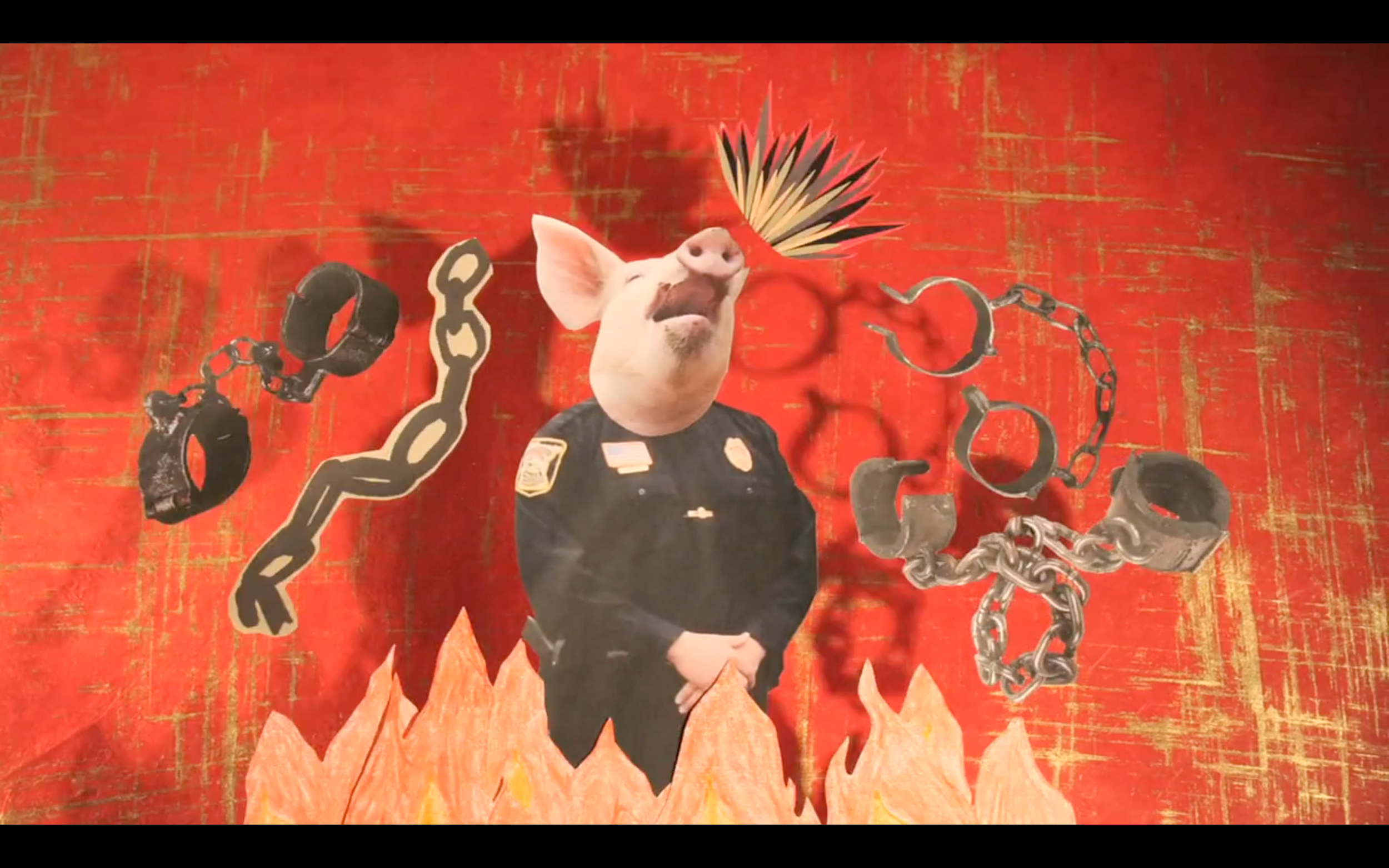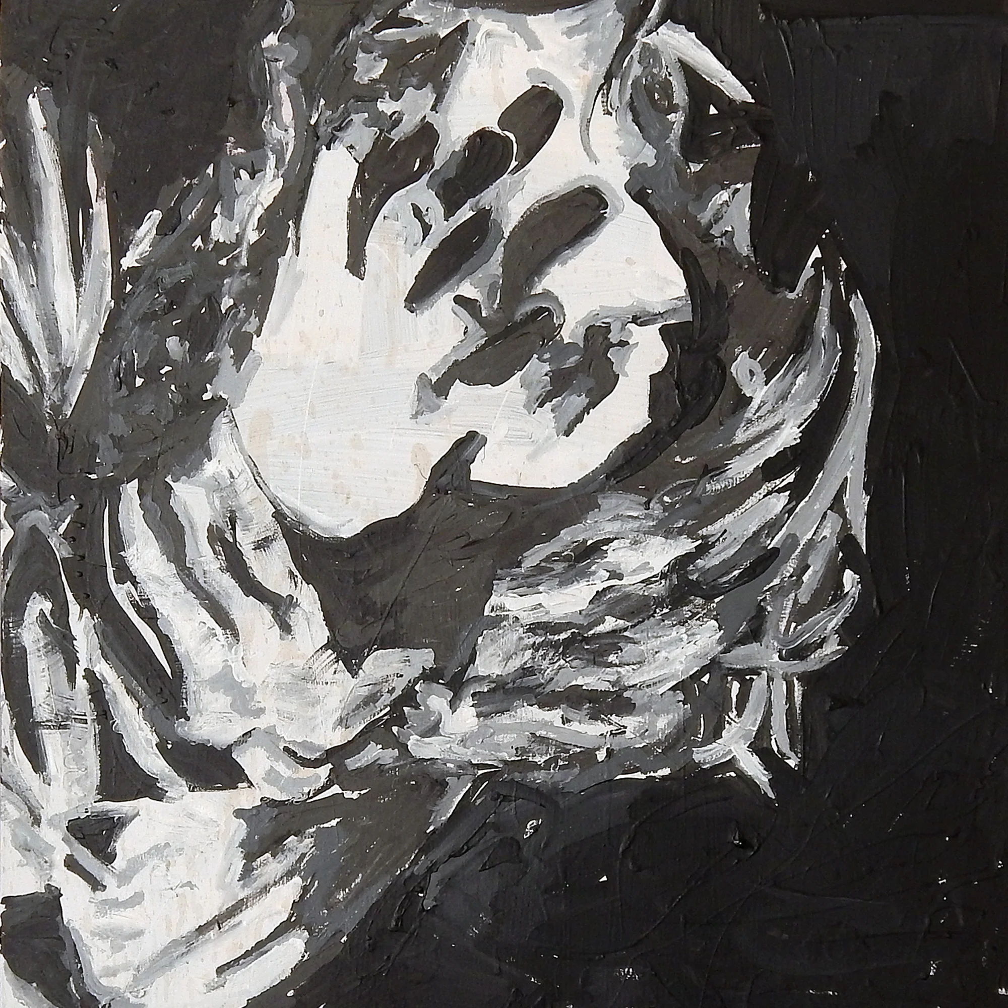 in a frame, face hidden behind her own black