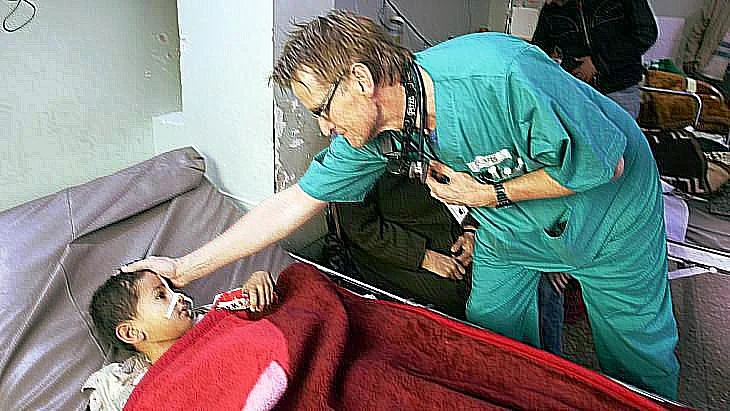 Dr. Mads Gilbert puts down the the bloodied bandage
